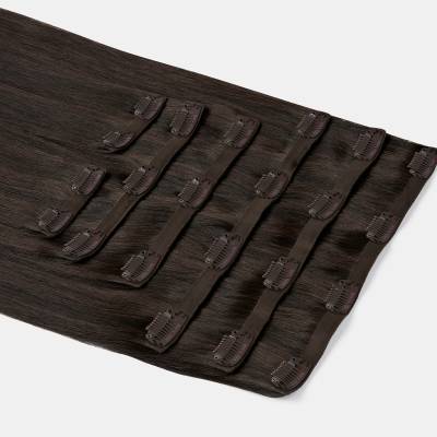 Experience the most natural-looking clip-in extensions with Beauty Works x Huda. This full 7-piece clip-in set of 100% Remy human hair, provides maximum coverage, blending effortlessly with your hair for a flawless finish. These lightweight extensions mimic the scalp for an undetectable, barely-there look. Add volume, fullness, or colour without the weight, perfect for concealing thinning areas or boosting your hair's natural thickness. The extensions allow you to experiment with colour, whether you're adding highlights, lowlights, or a contrasting hue, all without the commitment of dyes. These luxury hair enhancements deliver an instant transformation with easy at-home installation and removal in minutes. Experience a “push-up effect” that mimics natural hair, with colour-coded clips and a silicone layer to protect your hair from damage.