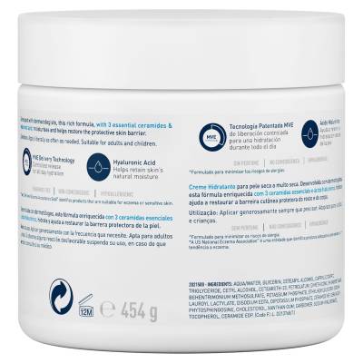 Developed with dermatologists, the rich formula of the CeraVe Moisturising Cream helps to protect the skin's natural barrier with three essential ceramides and MVE technology to provide daily instant and long-lasting hydration. Hyaluronic Acid helps to retain the skin’s natural moisture.