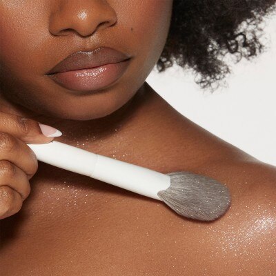 Body: For a more airy application, use the included sponge to gently dust Glitterpuck across your neck, decollete and shoulders. For a more intense sparkle on the body, use the Baby Paw Blush Brush or any buff brush to paint a denser layer of shimmer.