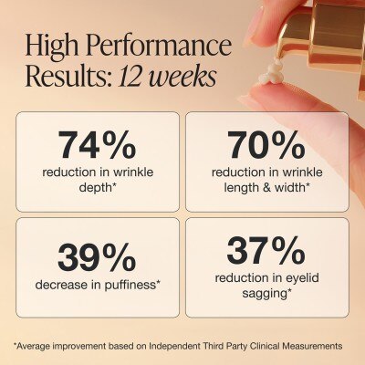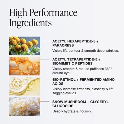 -Bio-Retinol and Fermented Amino Acids: Increase the appearance of firmness and elasticity and visibly lift sagging eyelids.