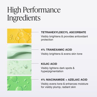 Aloe Barbadensis Leaf Juice, Glycerin, Water/Aqua, Helianthus Annuus (Sunflower) Seed Oil/Helianthus Annuus Seed Oil, Tranexamic Acid, Isosorbide Dicaprylate, Niacinamide,, Cannabis Sativa Seed Oil, Chenopodium Quinoa Seed Oil, Tetrahexyldecyl Ascorbate, Xanthan Gum, Kojic Acid, Lactic Acid, Alpha-Arbutin, Arthrospira Platensis Extract, Persea Gratissima (Avocado) Oil, Crithmum Maritimum Callus Culture Filtrate, Punica Granatum (Pomegranate) Seed Extract, Collagen Amino Acids, Potassium Azeloyl Diglycinate, Brassica Oleracea, Acephala (Kale) Leaf Extract, Spinacia Oleracea (Spinach) Leaf Extract, Moringa Oleifera Seed Oil, Sodium Hyaluronate, Melia Azadirachta Leaf Extract, Melia Azadirachta Flower Extract, Ocimum Sanctum (Holy Basil) Leaf Extract, Cucumis Sativus (Cucumber) Fruit Extract, Origanum Vulgare (Oregano) Oil, Thymus Vulgaris (Thyme) Oil, Curcuma Longa (Turmeric) Leaf Extract, Pinus Pinaster (Pine) Bark Extract, Boerhavia Diffusa Root Extract, Solanum Melongena (Eggplant) Fruit Extract, Corallina Officinalis Extract, Chondrus Crispus Extract, Coccinia Indica Fruit Extract, Citric Acid, Caprylyl Glycol, Butylene Glycol, Maltodextrin, Leuconostoc/Radish Root Ferment Filtrate, 1,2-Hexanediol, Potassium Sorbate, Sodium Benzoate, Amber Powder, Hydroxyacetophenone.