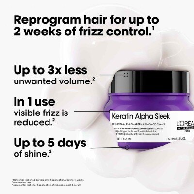 For instantly smoother hair, use this mask. Use after Keratin Alpha Sleek Professional Shampoo, apply evenly from lengths to tips. Leave in for 5 minutes and rinse.