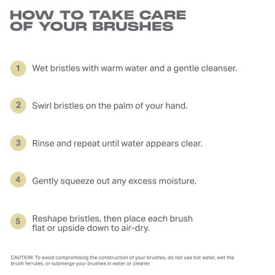 CAUTION: To avoid compromising the brush construction, do not use hot water, wet the brush ferrule, or submerge your brush in water or cleaner.